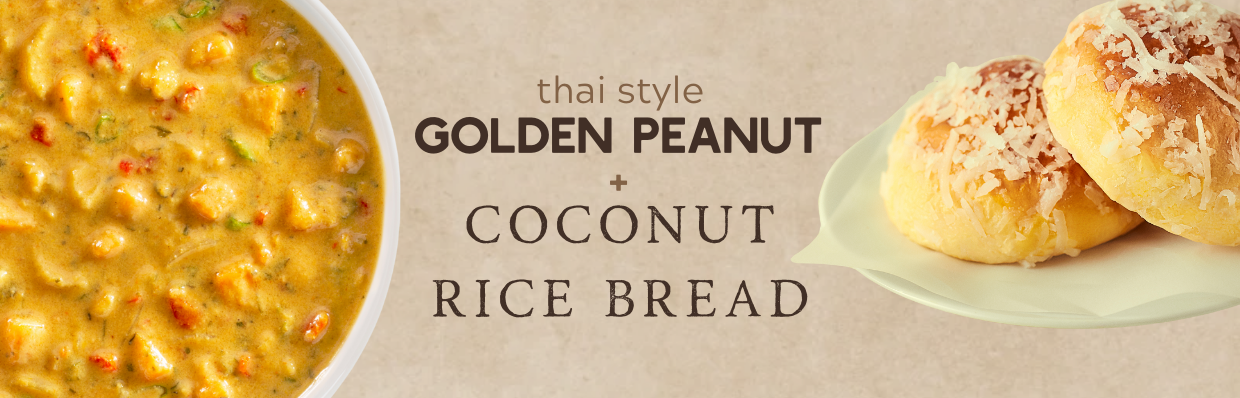This soup blends savory peanut with warm spices for a rich, nutty profile. Coconut rice bread adds a gentle sweetness and tropical flair, echoing the soup’s Southeast Asian roots.
