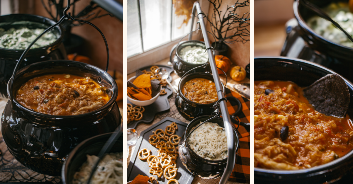 This year, I went full witchy and filled three mini hanging cauldrons with our dips: Spinach Artichoke, Chipotle Taco, and Avocado Dill. It made the whole snacking setup feel so fun — and yes, it literally elevated the experience since they were hanging above the counter. Bonus: I could sneak decor underneath, adjust them for photos, and hone in my food stylist skills for an afternoon.