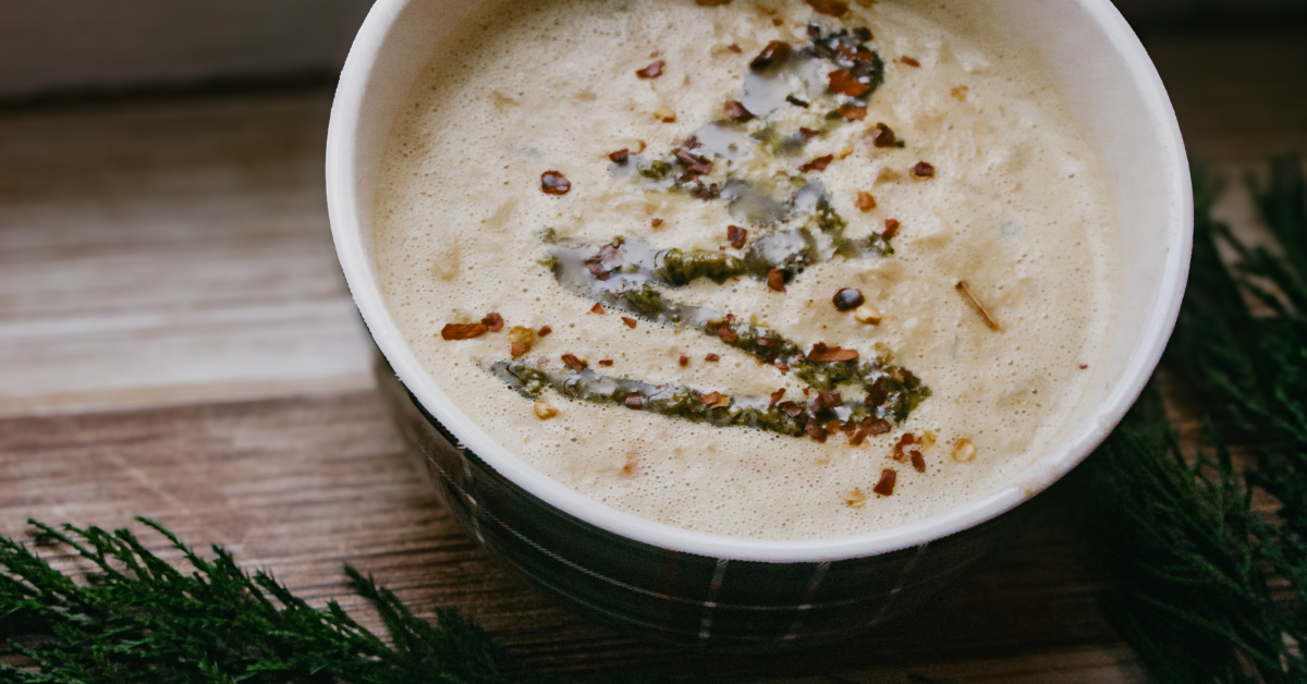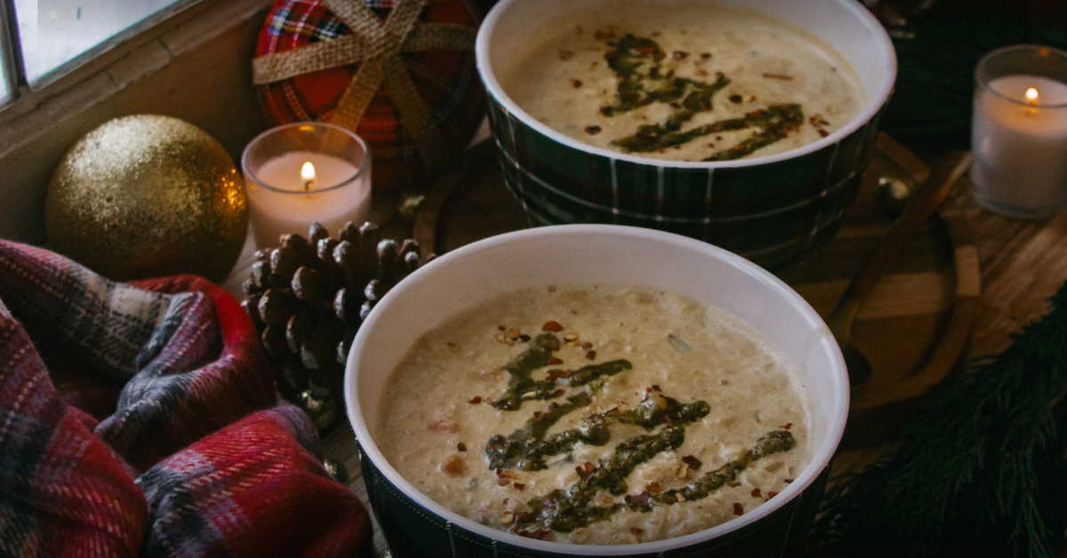 Picture this: a silky bowl of winter-white soup topped with a pesto drizzle Christmas tree—zig-zag branches, red pepper flakes as tiny ornaments, and just enough festive chaos to make it look intentional. And honestly? She turned out pretty cute.