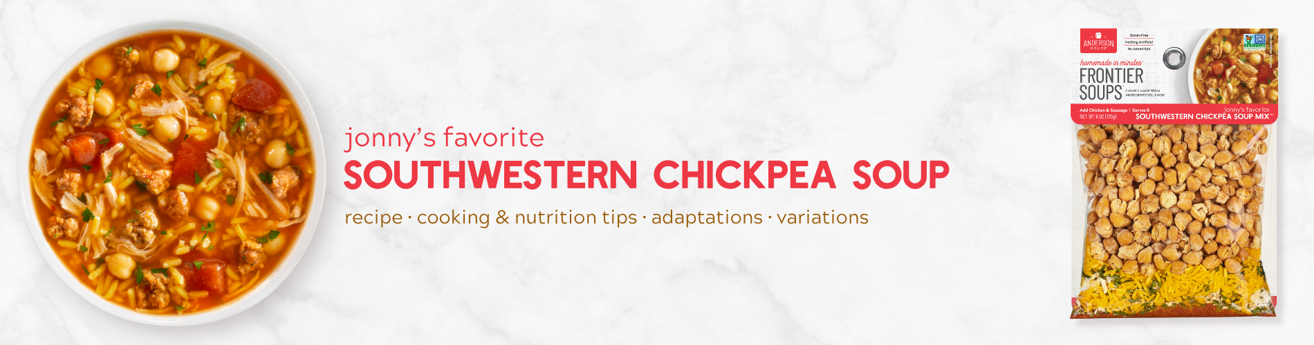 - 1 (6-ounce) package of Frontier Soups Jonny’s Favorite Southwestern Chickpea Soup mix